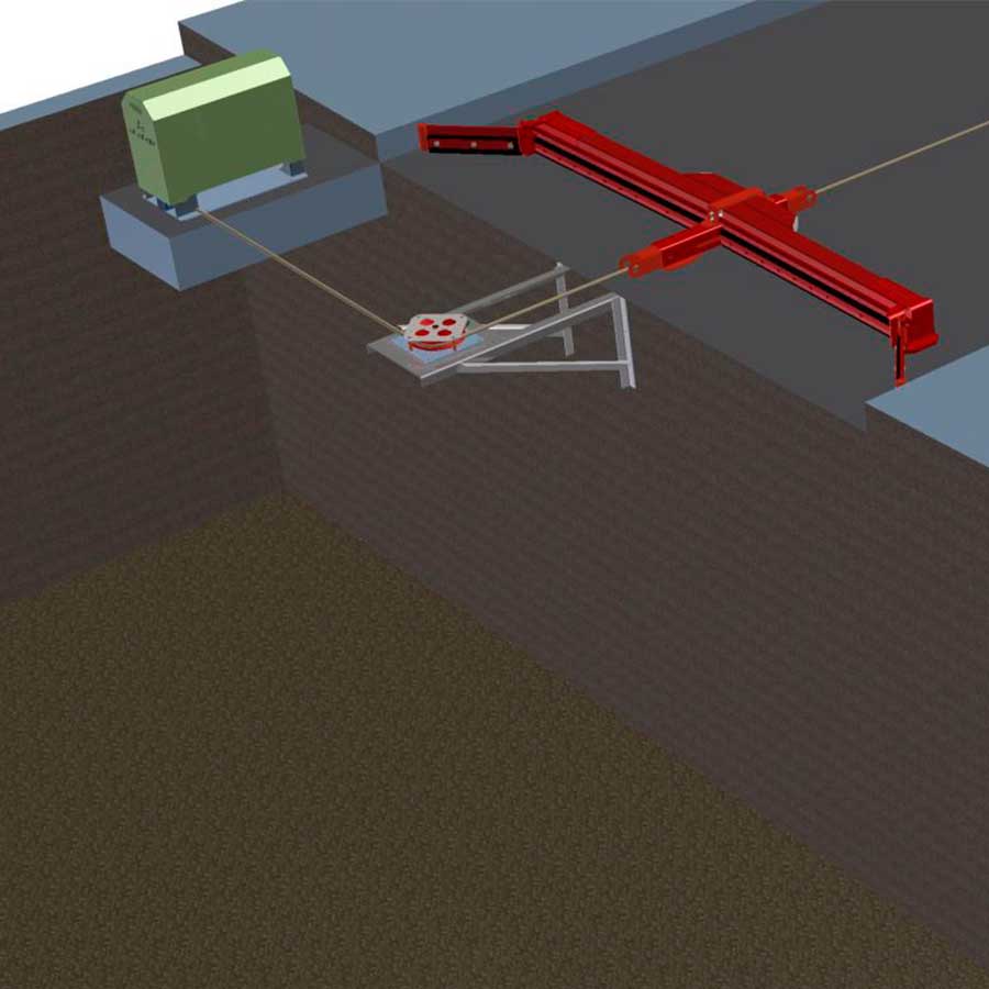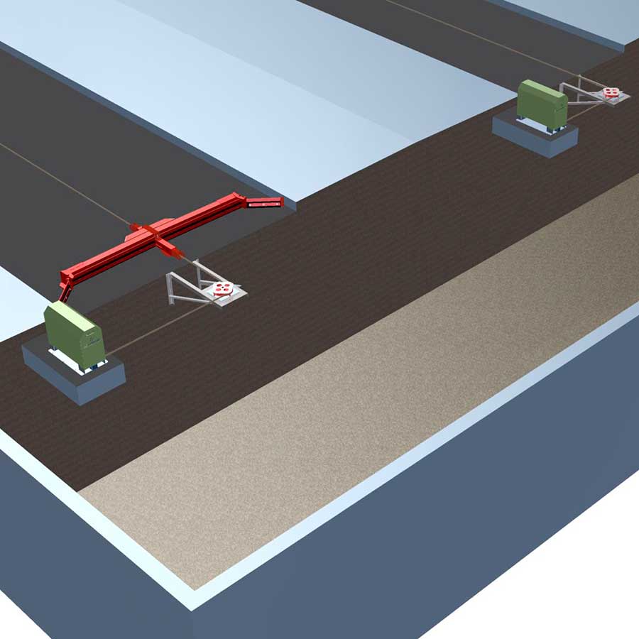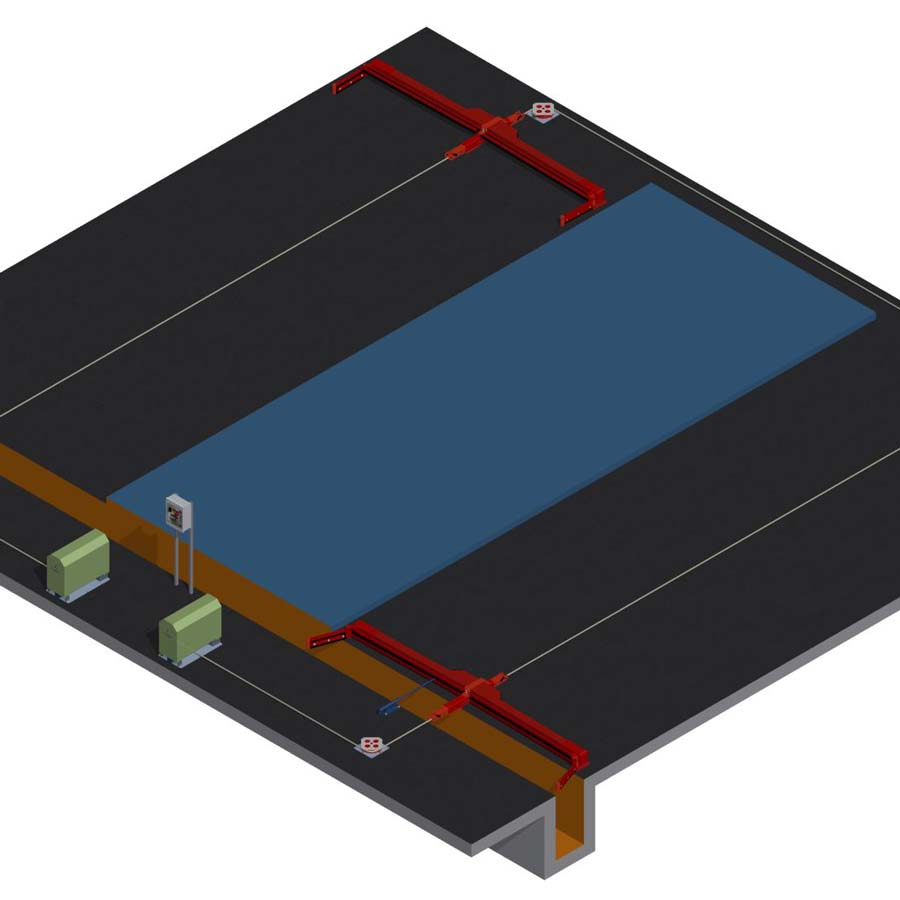 With this system, it is necessary to install two motors, which allows us to adapt to any type of distribution of the block, being able to place the motors in any position. A two-motor system can clean 1, 2 and even up to 3 aisles, of various lengths, being able to reach 100m in length depending on the configuration.