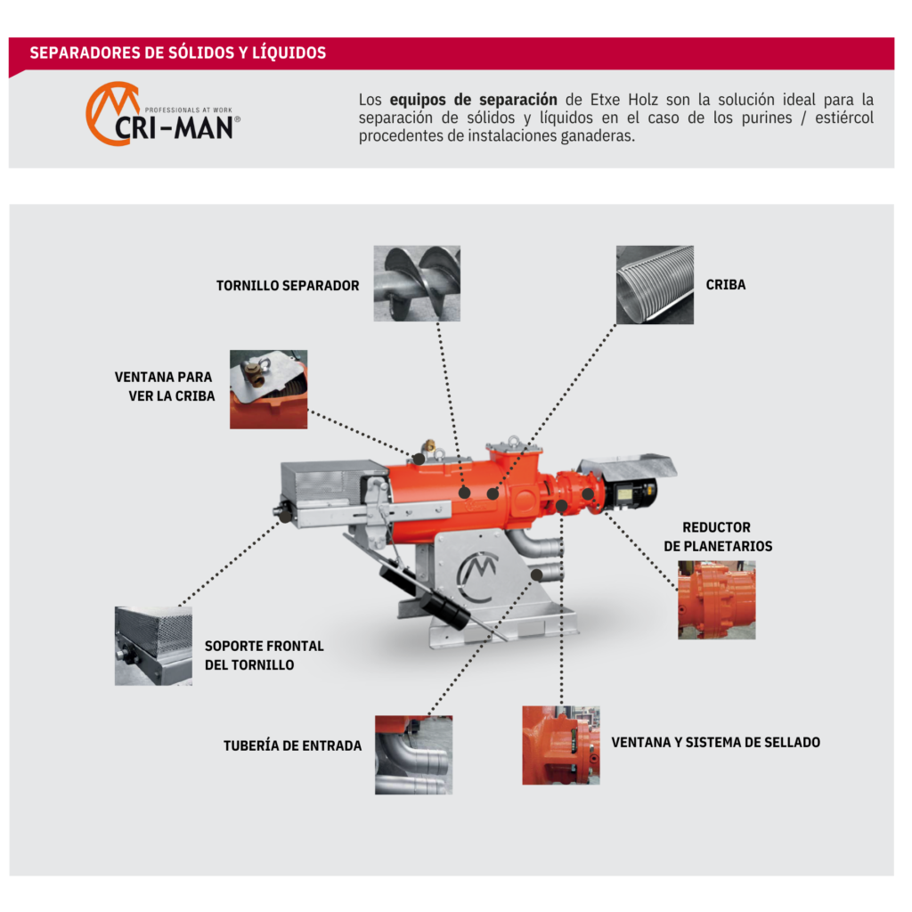 - Separadores sólido-líquido: al separar la fracción líquida de la fracción sólida de los purines se detiene la acción de la ureasa, disminuyendo las emisiones de amoníaco. Además, separando la fracción sólida, se evita que se encuentre en estado de saturación. De esta manera, prevenimos la anaerobiosis y, por lo tanto, disminuyen las emisiones de metano y óxido nitroso. Contamos con una amplia gama de separadores cuya potencia de motor puede variar entre los 3 y los 7,5 kW. Dependiendo de las necesidades de cada caso se analiza la capacidad necesaria por hora y el porcentaje de materia seca a separar.