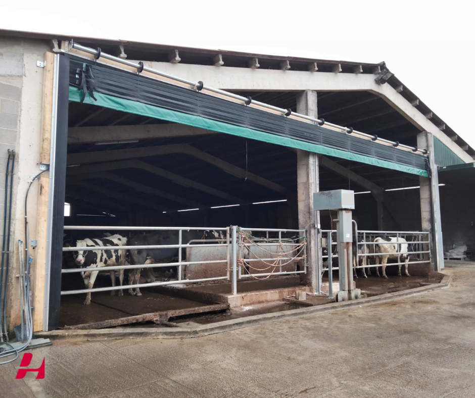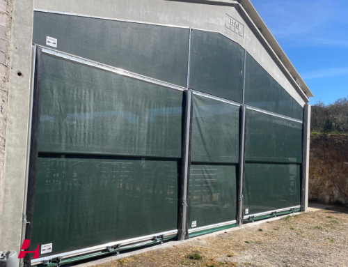 En este caso se ha instalado un sistema folding front motorizado de 13 metros y medio por 4 metros de alto que permite el cerramiento frontal de la nave. Su porcentaje de frenada es del 94% con el fin de combatir tanto el viento como la lluvia permitiendo, a su vez, la transpirabilidad.