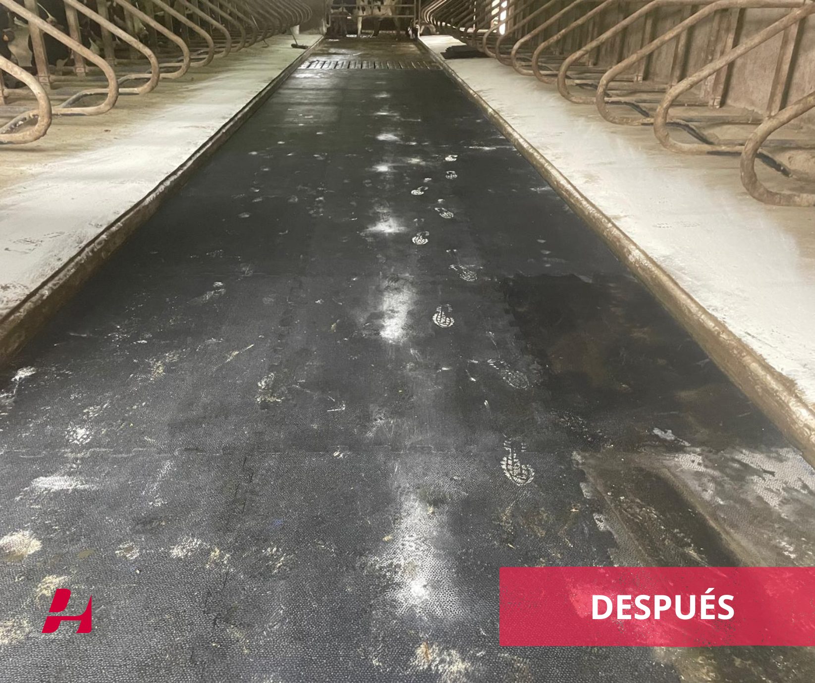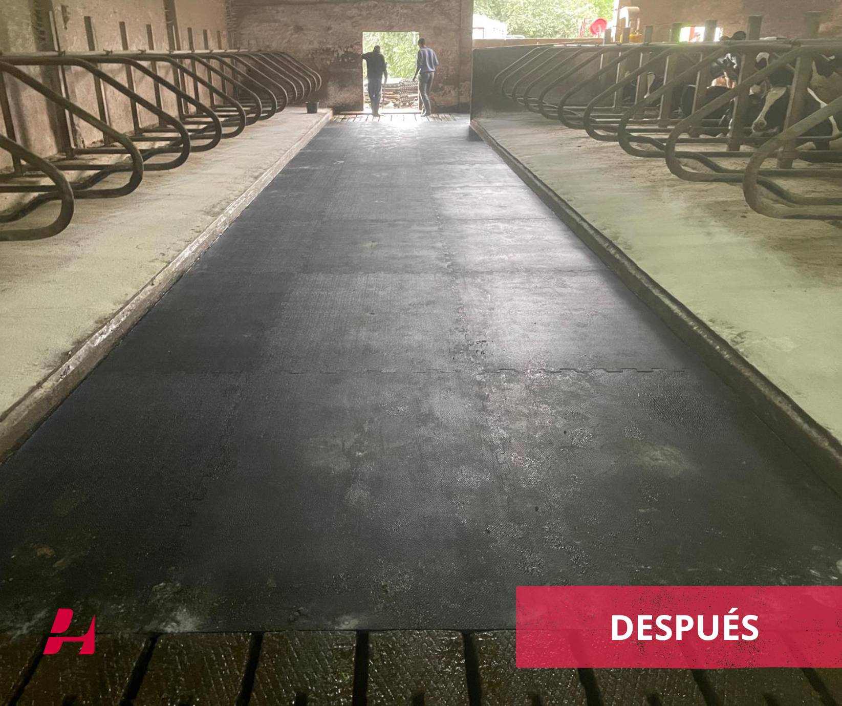 En este caso, hemos instalado el modelo Interlock, que está fabricado con caucho 100% reciclado y es recomendable tanto para pasillos como salas de espera y ordeño.