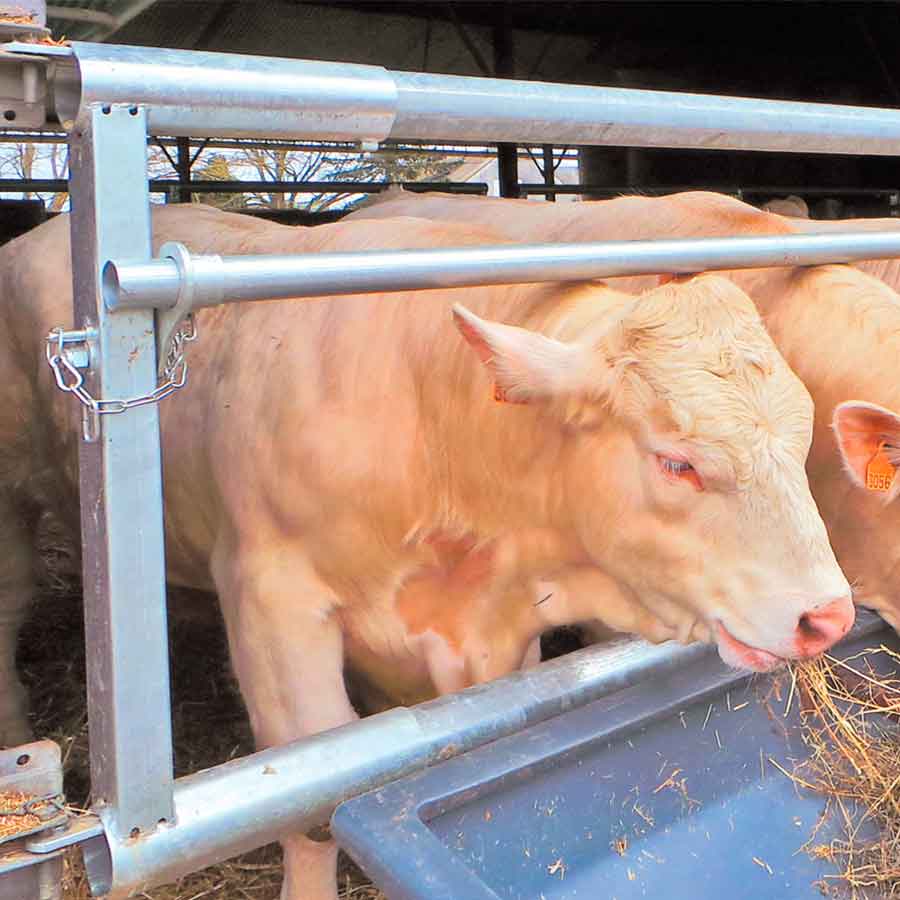 Paneles de 3 tubos para el engorde de terneros, si bien permite otras utilidades. Está formado por un marco sin soldaduras que a su vez se constituye de 2 tubos Trèfle 102mm con un travesaño cuadrado de 100×60 montado mediante abrazaderas. Poseen una tercera barra central Ø 60 mm cuya altura se puede ajustar de acuerdo a las necesidades específicas dadas por la edad o la raza de los animales.