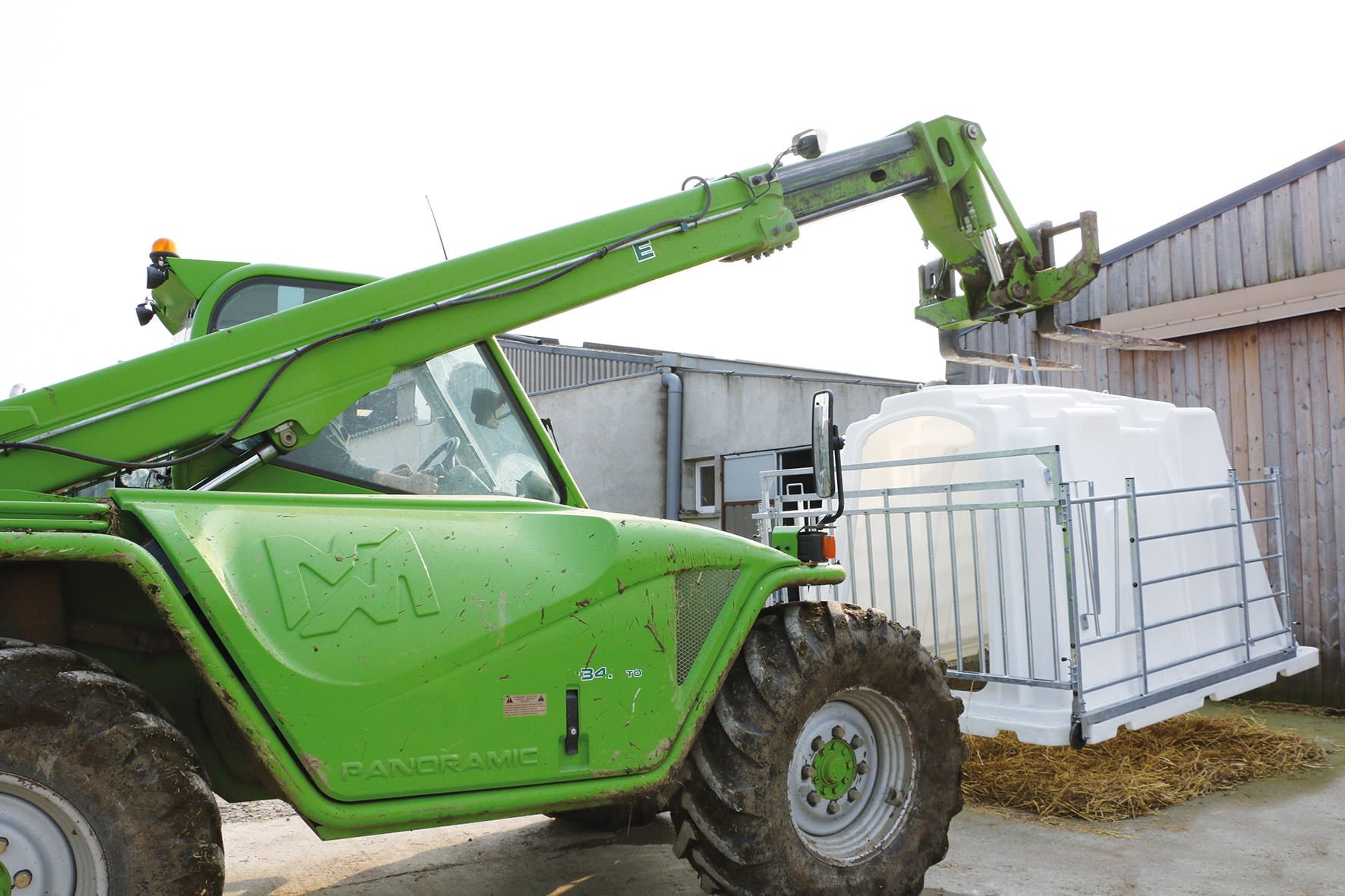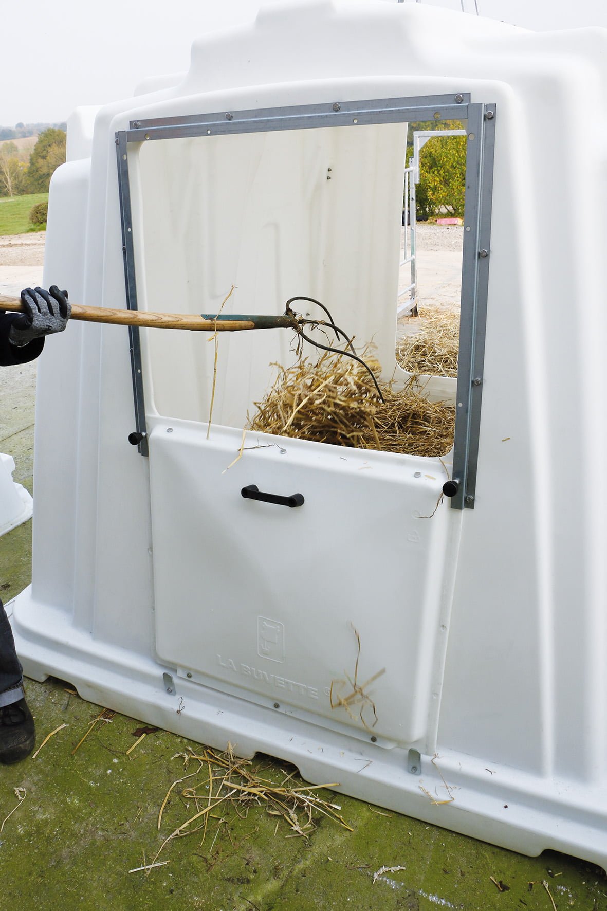 El parque opcional se recoge muy fácilmente, deslizando sobre las pequeñas ruedas que lleva incorporados. Queda totalmente acoplado a la caseta, actuando como puerta para evitar que salgan los terneros.