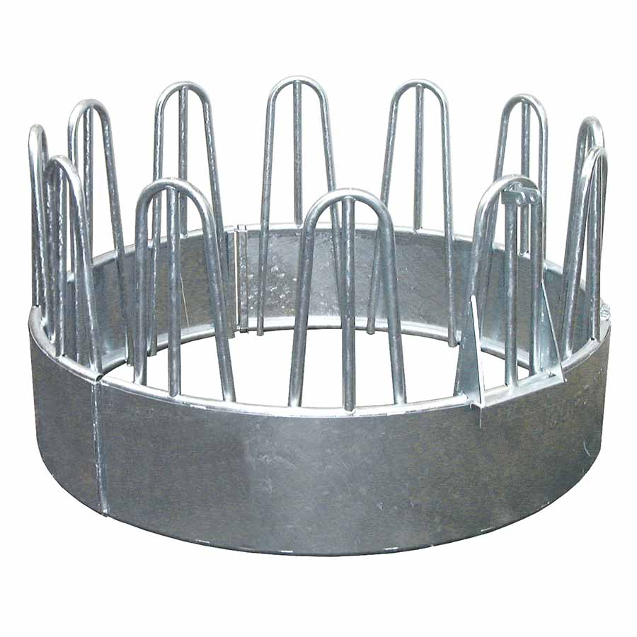 Comedero circular Jourdain para paca redonda acostada, anti-desperdicio, chapa de acero sobre 0,55 m. 12 pasos de cabeza para animales con cuernos. Doble corona tubo ø 49. En 3 partes, sin ángulos agresivos. Diámetro exterior : 2,30 m. Peso: 193 kg.