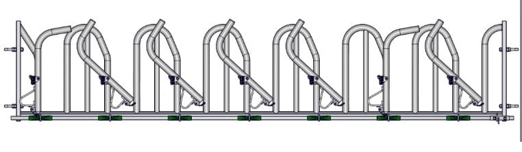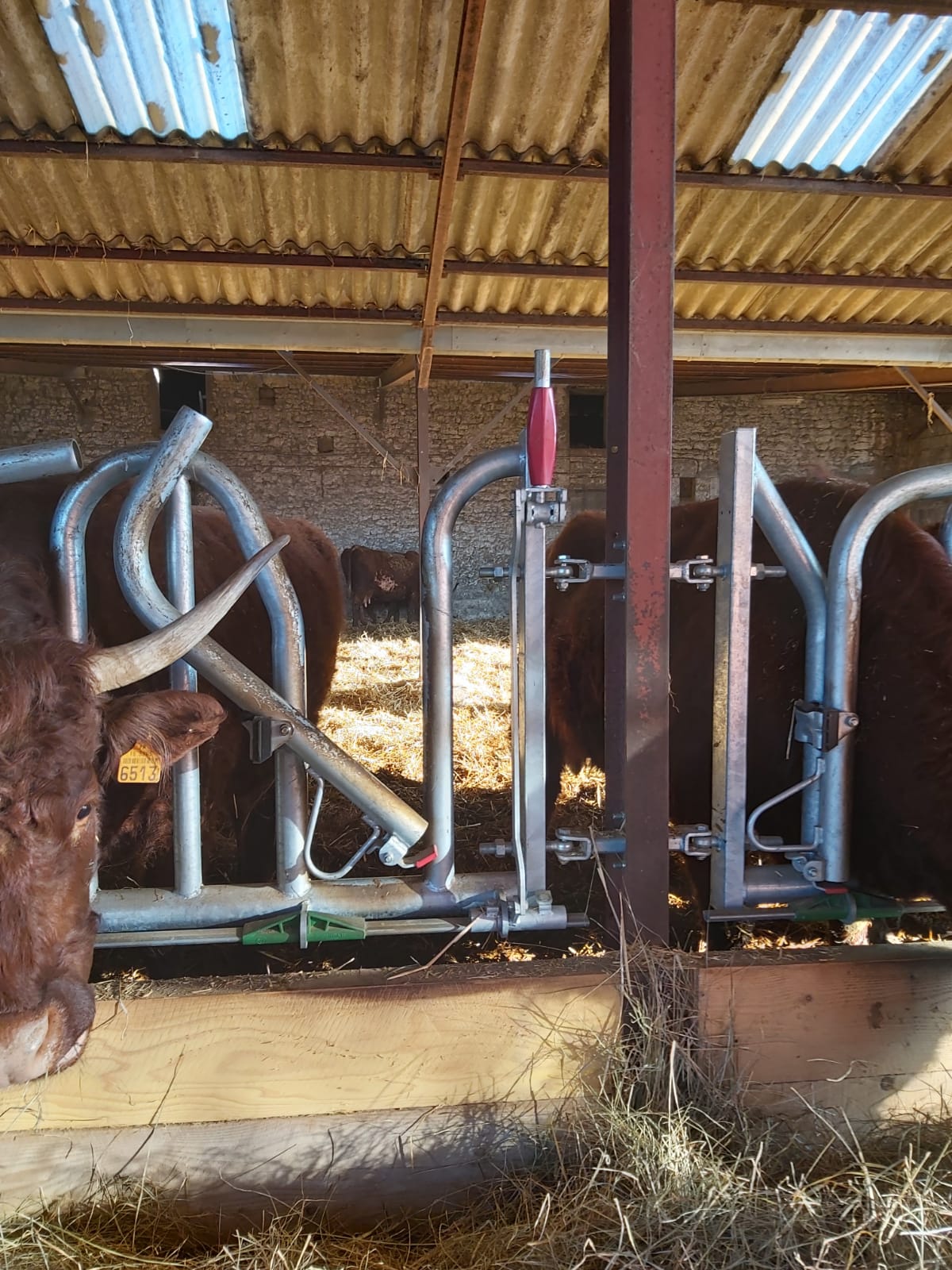Cornadizas para vacuno de leche y vacuno de carne con astas de gran de tamaño. Se trata de un modelo de cornadiza autocaptura automática, con cierre desde abajo y plaza fija.