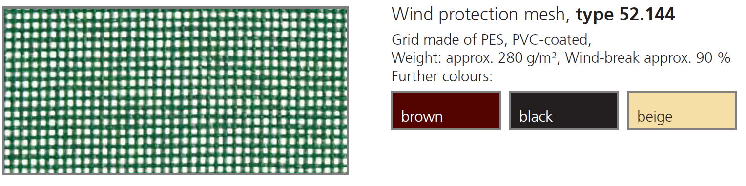 CORTAVIENTOS MODELO 52.144 Malla fabricada en poliéster cubierto con PVC Peso: 280 g/m2 aprox Porcentaje de frenado de viento: 90% Colores: marrón, negro, beige Aplicaciones: cerramientos laterales, frontales |