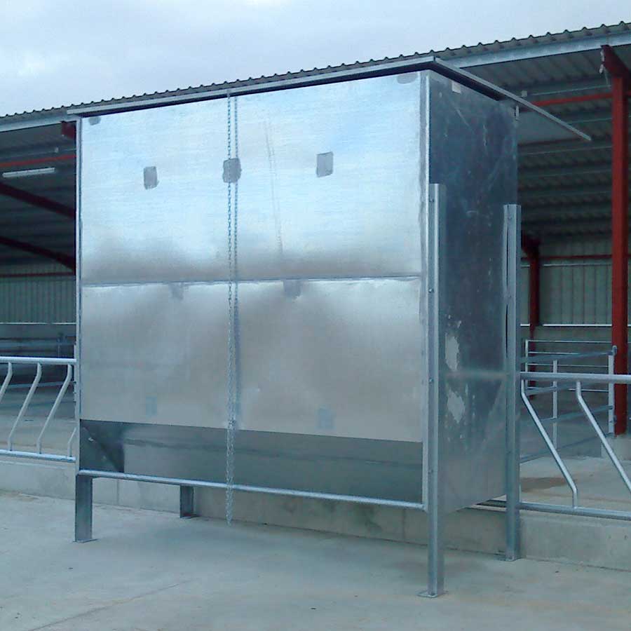 Tolvas para vacuno de leche y vacuno de carne. Construidas en chapa galvanizada sin aristas vivas y con techo basculante. Diferentes capacidades y medidas.