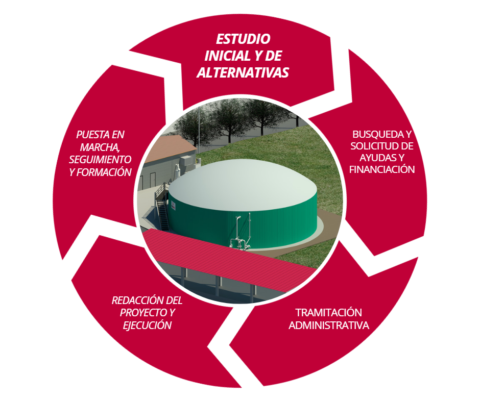 Por ello, desde ETXE HOLZ, con una experiencia de más de 15 años en proyectos de biogás, ofrecemos un asesoramiento individualizado a cada cliente en función de su tipo de actividad, ubicación y circunstancias técnico – económicas. A continuación, puede verse el ciclo completo del proyecto de biogás: